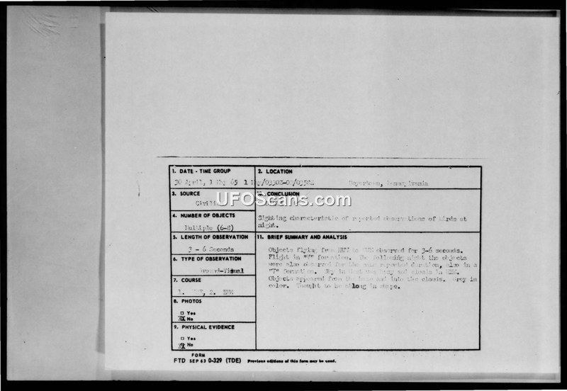 This document collection contains correspondence and reports regarding UFO sightings in April 1965, primarily focusing on an incident in Bogertown, Pennsylvania. On April 30 and May 1, 1965, a witness reported seeing multiple objects flying in a 'V' formation at night. The objects were described as gray, oblong, and moving from NNW to NNE without making any sound. The witness noted that the sky was hazy in the west and northeast but clear overhead, and that the objects appeared to be surrounded by a hazy light. The Foreign Technology Division of the U.S. Air Force, under the direction of Major Hector Quintanilla, Jr., investigated the report and concluded that the objects were likely migrating birds, such as plovers, reflecting light from ground sources. The collection also includes correspondence between James C. Cornell, Jr. of the Smithsonian Institution and Raymond E. Fowler of NICAP, discussing the forwarding of UFO reports. Additionally, the document contains brief reports on other sightings, including a 'fireball' over Howth, Ireland, and a 'wailing light' over Whidbey Island, Washington, as well as a list of sightings from May 1965.