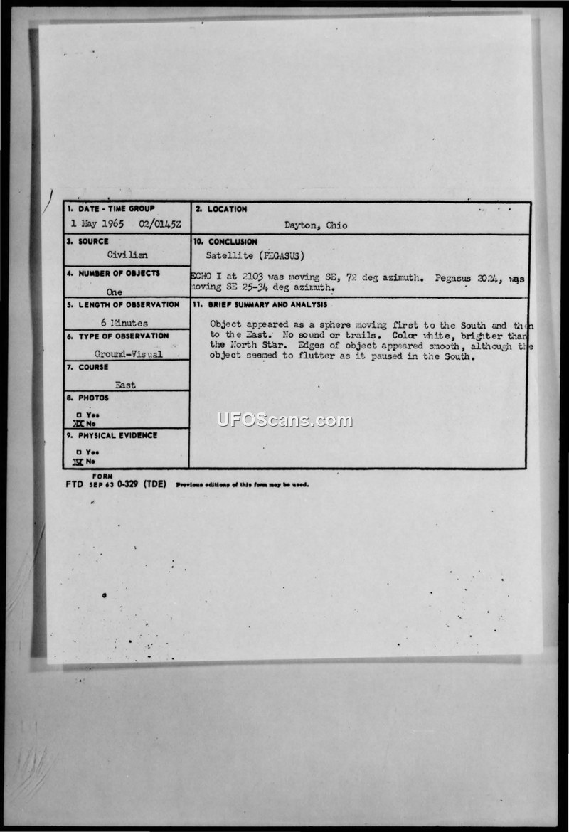 Most sightings were identified as satellites (ECHO I, ECHO II, PEGASUS) or aircraft. One report of three objects on 18 May 1965 was initially regarded as aircraft, though the witness noted inconsistencies with satellite behavior.