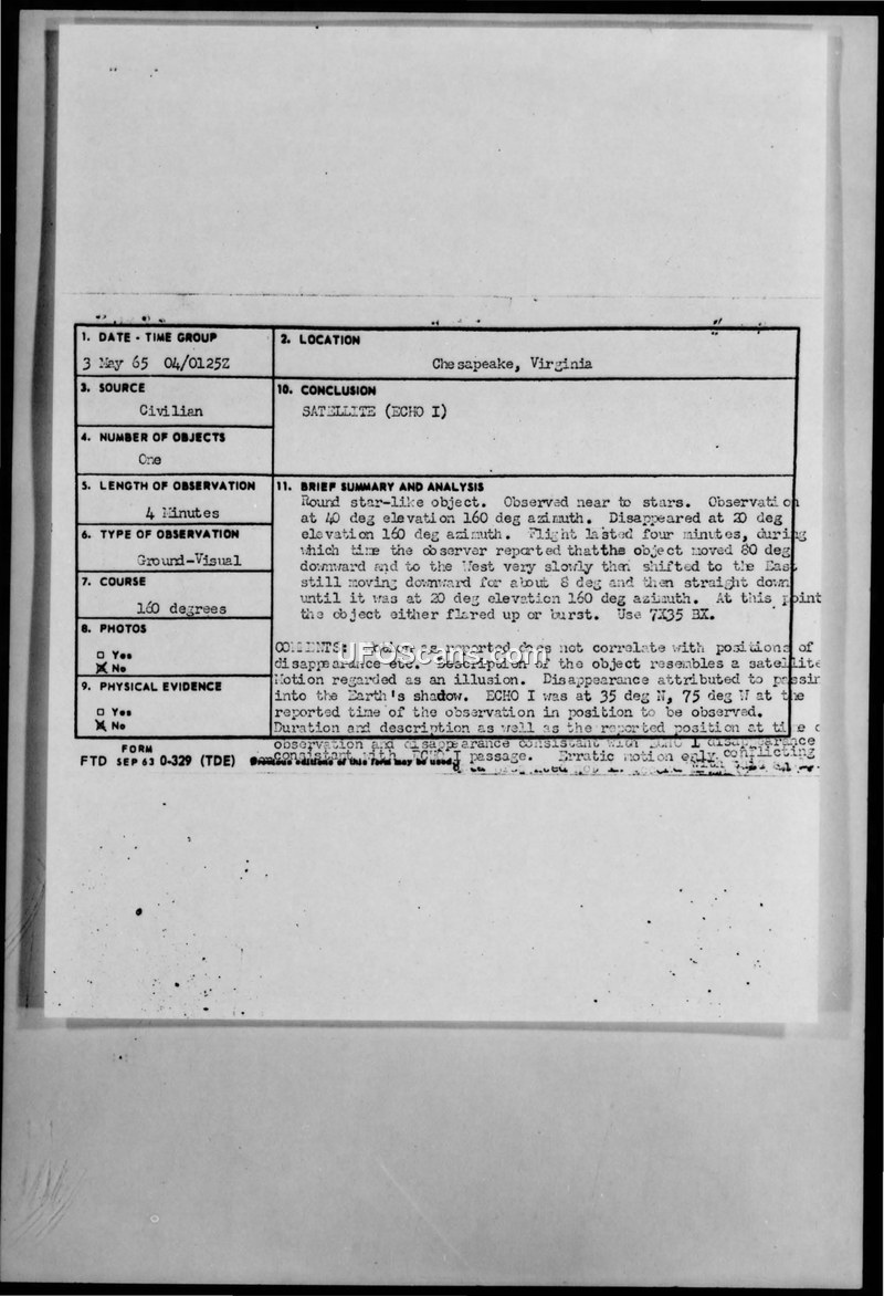 Unidentified Flying Object Sighting Report — Chesapeake, Virginia, May 1965