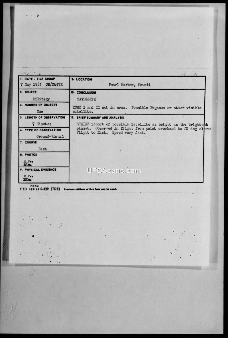 Military reports from May 1965 document an aerial object over Pearl Harbor, Hawaii, which was officially identified as a satellite, likely Pegasus, rather than a UFO.