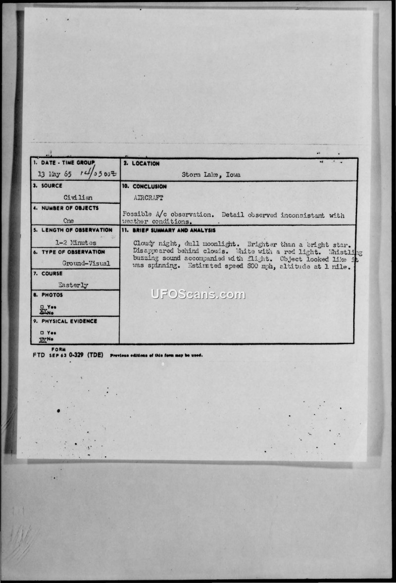 A 13-year-old witness in Storm Lake, Iowa, reported a spinning, saucer-shaped object on May 13, 1965. The Air Force concluded it was a possible aircraft, despite the witness's claims of high speed and unusual behavior.
