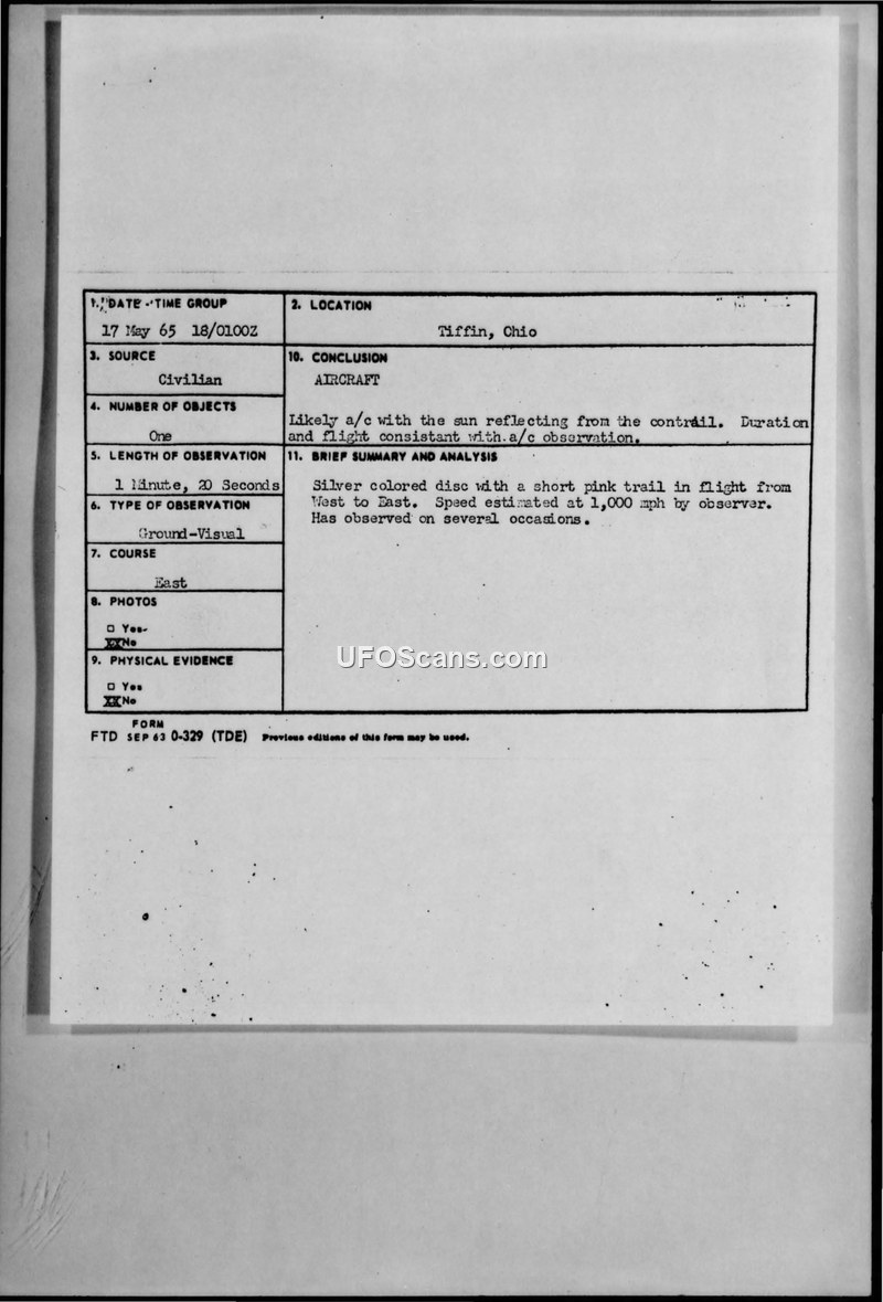 A 1965 UFO sighting report from Tiffin, Ohio, was evaluated by the Air Force's Foreign Technology Division. The object was officially identified as a jet aircraft with sun-reflecting contrails.