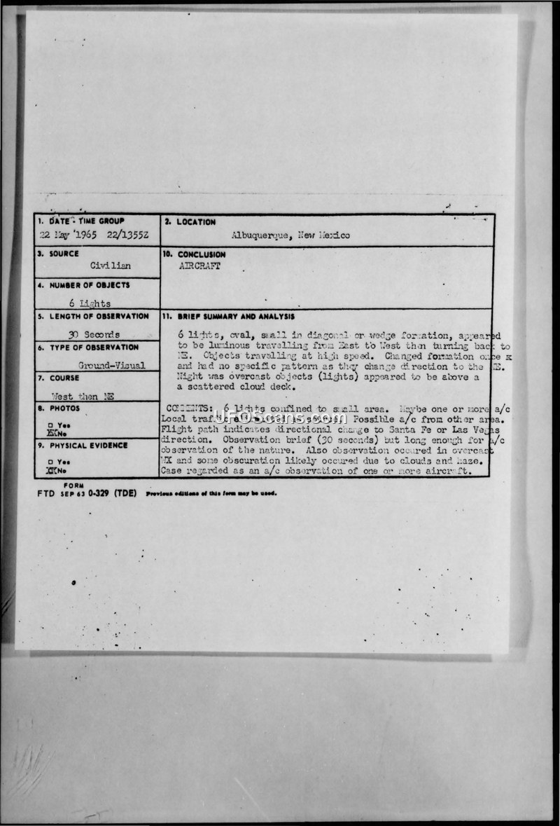 A family in Albuquerque reported seeing six luminous, oval objects in a wedge formation on May 22, 1965. The Air Force concluded the sighting was likely commercial aircraft.