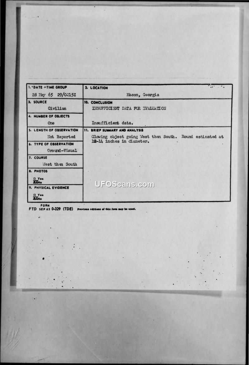 A civilian report of a glowing, round object in Macon, Georgia, on 28 May 1965. The Air Force concluded there was insufficient data for evaluation.