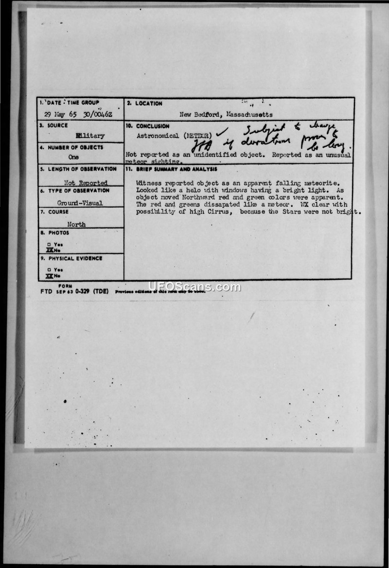 On May 29, 1965, at 1946 EST, a USAF Captain driving eastward in New Bedford, Massachusetts, observed an object he initially described as an 'apparent unusual falling meteorite.' The witness noted that the object resembled a helicopter with windows and a bright white light. As the object moved northward, it displayed red and green colors before dissipating in a manner similar to a meteor. The witness reported that the weather was clear, though he noted the possibility of thin cirrus clouds because the stars were not bright. He also specified that the observation was made through the curved safety glass of a 1961 Chevrolet. The official conclusion recorded on the FTD form is 'Astronomical (METEOR),' with a note added by an evaluator stating the conclusion is 'subject to change if duration proves to be long.' The report explicitly states the object was not considered an unidentified object.