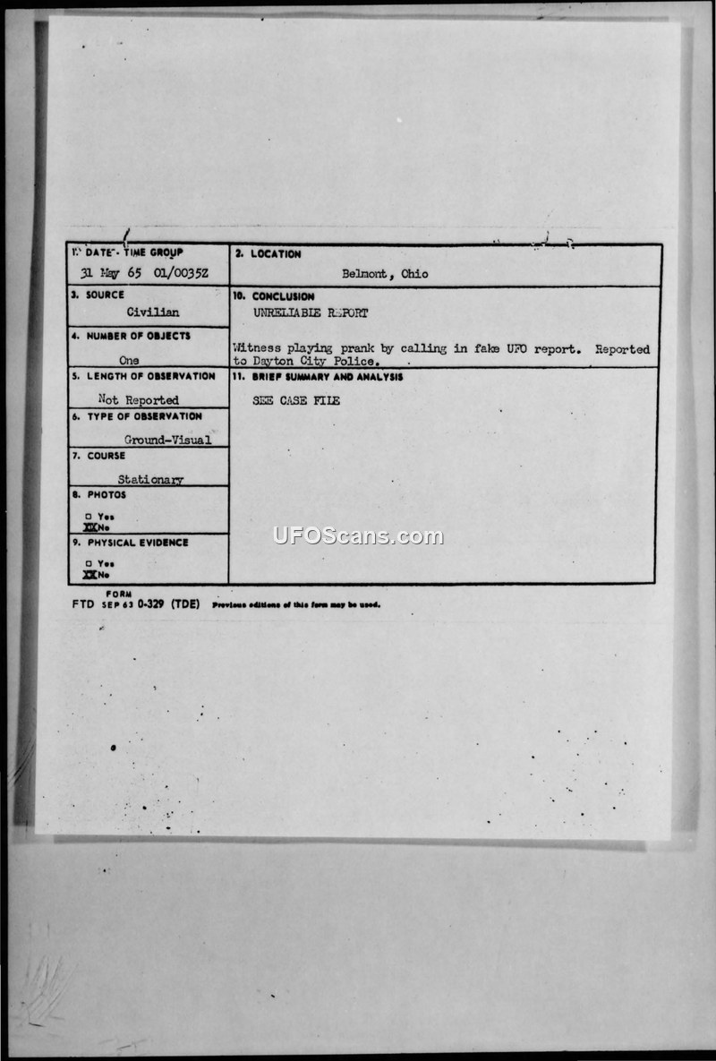 A 1965 UFO sighting report from Belmont, Ohio, was officially classified as a hoax after the witness was found to be playing a prank on the Dayton City Police.