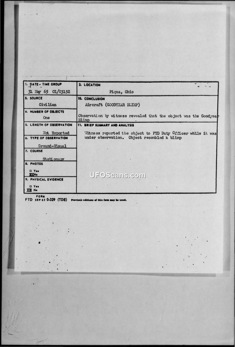 A civilian reported a stationary UFO in Piqua, Ohio, on May 31, 1965. The FTD investigated the report and concluded the object was the Goodyear Blimp.