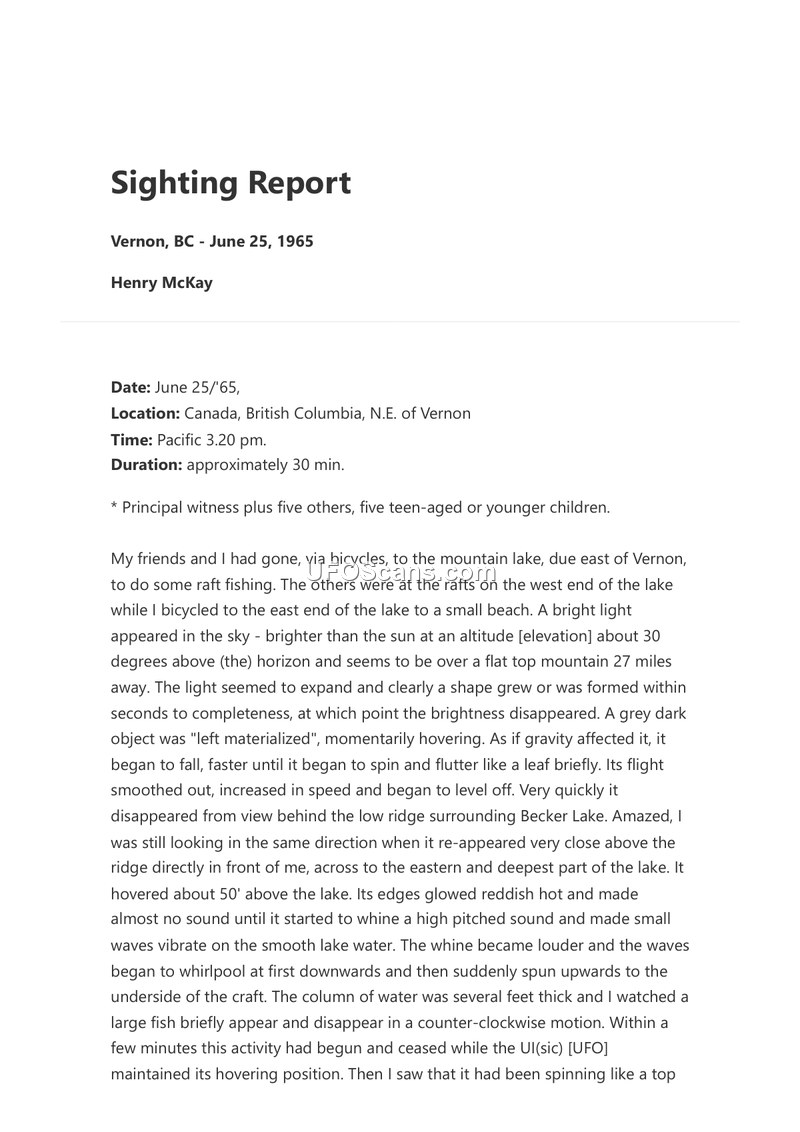 Sighting Report — Vernon, BC — June 25, 1965