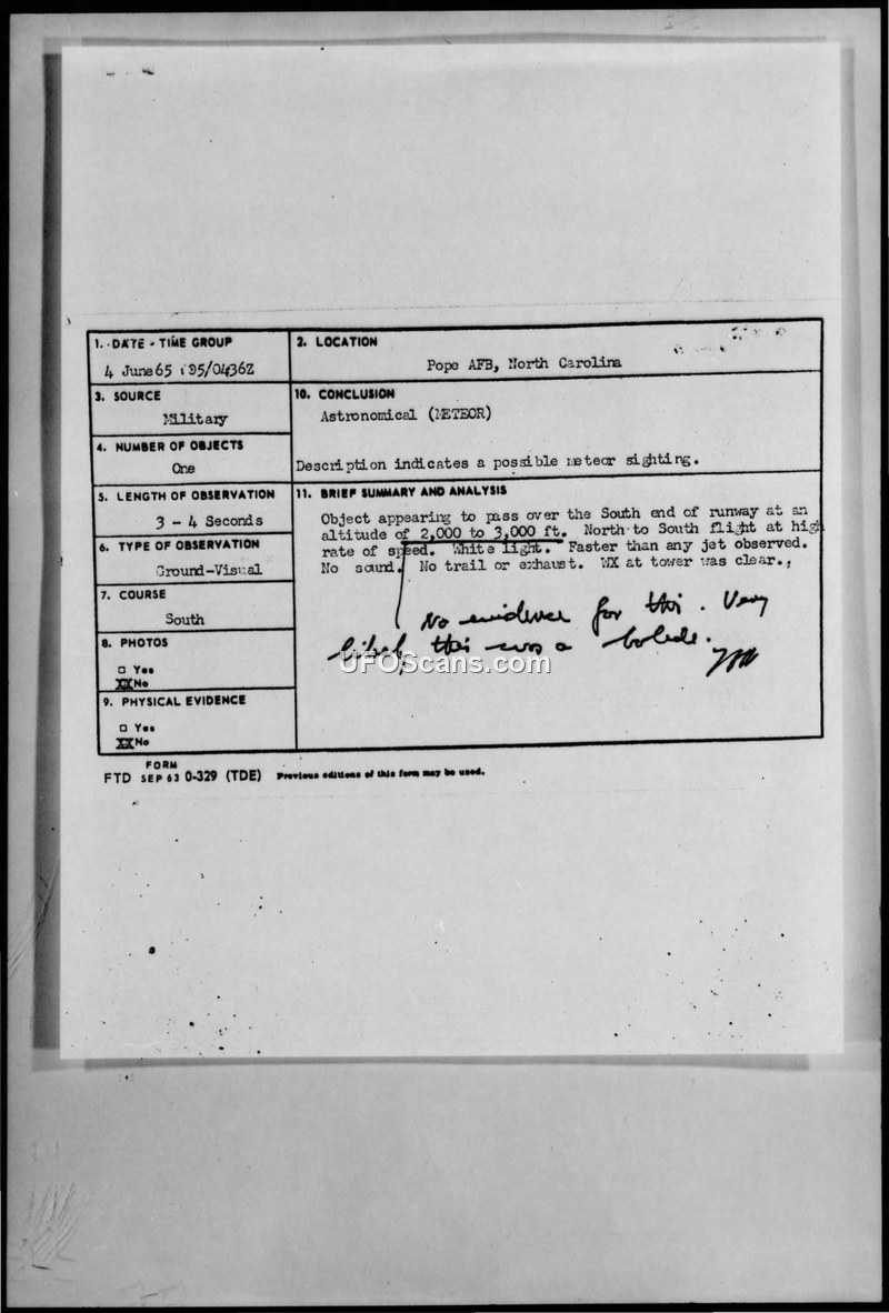 Unidentified Flying Object Sighting Report — Pope AFB, North Carolina, 5 June 1965
