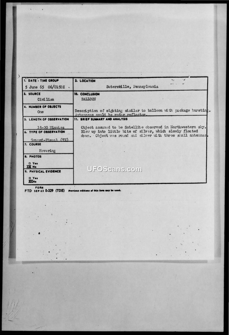 This document collection details a civilian UFO sighting reported in Sutersville, Pennsylvania, on June 5, 1965. The witness, observing through a telescope, reported seeing a silver, round object with three small antennas hovering in the northwestern sky for approximately 15 to 20 minutes. The witness described the object as 'blowing up' into small silver pieces that slowly floated down. The witness initially contacted NASA's Manned Spacecraft Center to inquire if a satellite had exploded. The report was subsequently forwarded to the Foreign Technology Division and the 9th Aerospace Defense Division (ADC) for investigation. The 9th Aerospace Defense Division, in coordination with USAF SPACETRACK, conducted an analysis and concluded that the observation could not be correlated with any known satellite decay. They noted that the closest event, the decay of the GT 4 sustainer body (SPADATS Object 1391), occurred 16 hours later and in a different location. The official conclusion reached by the Air Force was that the object was a balloon with an instrument package, such as a radiosonde or rawinsonde, that had burst. The 'antennae' reported by the witness were identified as a radar reflector. The Air Force emphasized that satellites are typically too dim to be observed with such detail through a telescope and that the visual sighting of antennae at orbital or decay altitudes is extremely unlikely.