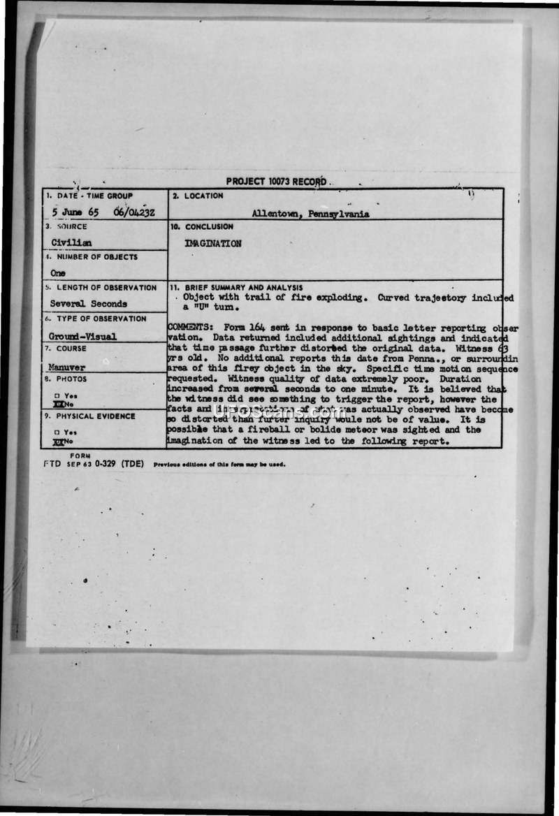 Project 10073 Record — Allentown, Pennsylvania, 5 June 1965