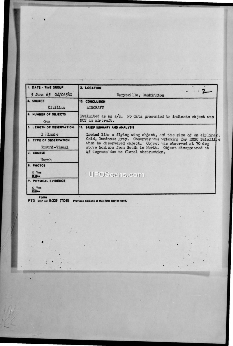 On 5 June 1965, at 0658Z, two civilian witnesses in Marysville, Washington, reported observing an unidentified object. The witnesses, a 51-year-old paper mill worker and a 47-year-old nurse, were watching for the ECHO satellite when they spotted the object. They described the object as a 'flying wing' with a 'cold, luminous gray' appearance, noting that it was approximately the size of an airliner. The object was observed at 70 degrees above the horizon, moving from South to North, before disappearing at 45 degrees due to a 'floral obstruction.' The duration of the sighting was one minute. The Air Force investigation, conducted by the 57th Fighter Group, noted that the witnesses were considered highly reliable. However, the report concluded that the object was evaluated as an aircraft, stating that there was no data to suggest it was anything else. Both the Seattle Air Traffic Control and the Seattle Air Defense Sector were unable to correlate the sighting with any known air traffic or radar returns. A check with local law enforcement indicated no previous reports or derogatory information regarding the witnesses. Despite the credibility of the witnesses, the Air Force found no supporting evidence to confirm the nature of the object.