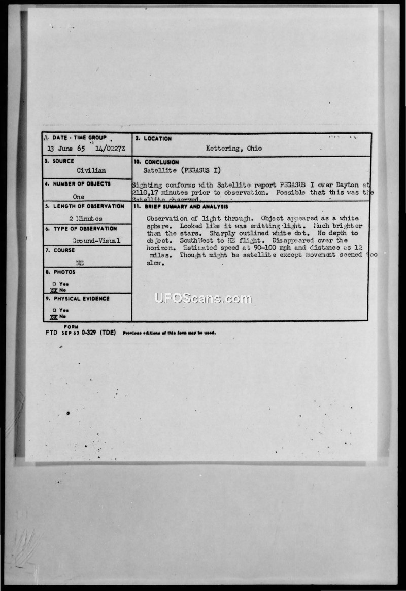 A 14-year-old witness in Kettering, Ohio, reported a bright, light-emitting sphere on June 13, 1965. The Air Force concluded the object was likely the PEGASUS I satellite.