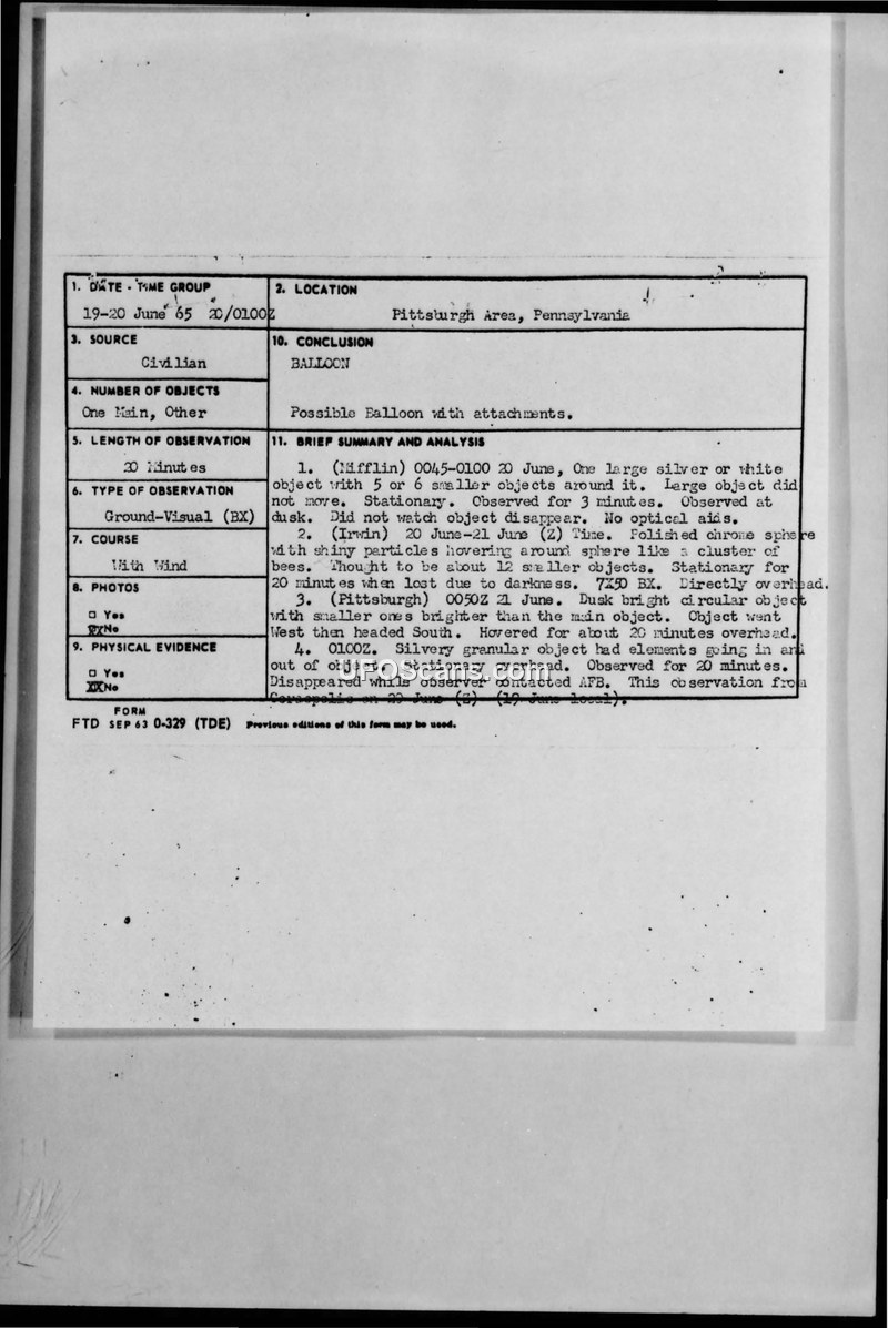 This document details multiple UFO sightings in the Pittsburgh area in June 1965, which were officially concluded to be a balloon with attachments. Despite the witnesses' detailed descriptions, military investigators and local agencies could not corroborate the sightings.