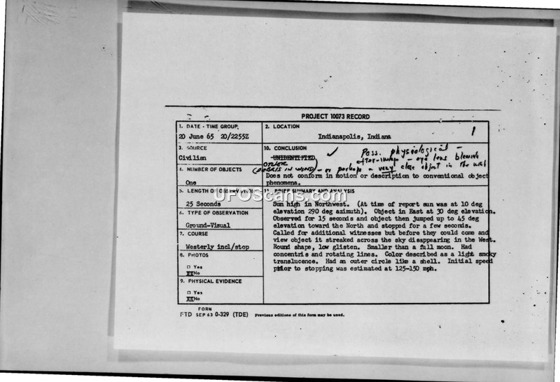 A civilian in Indianapolis reported a 25-second sighting of a round, translucent object with concentric lines on June 20, 1965. The Air Force officially classified the event as not conforming to conventional phenomena, though handwritten notes suggest potential physiological or environmental causes.