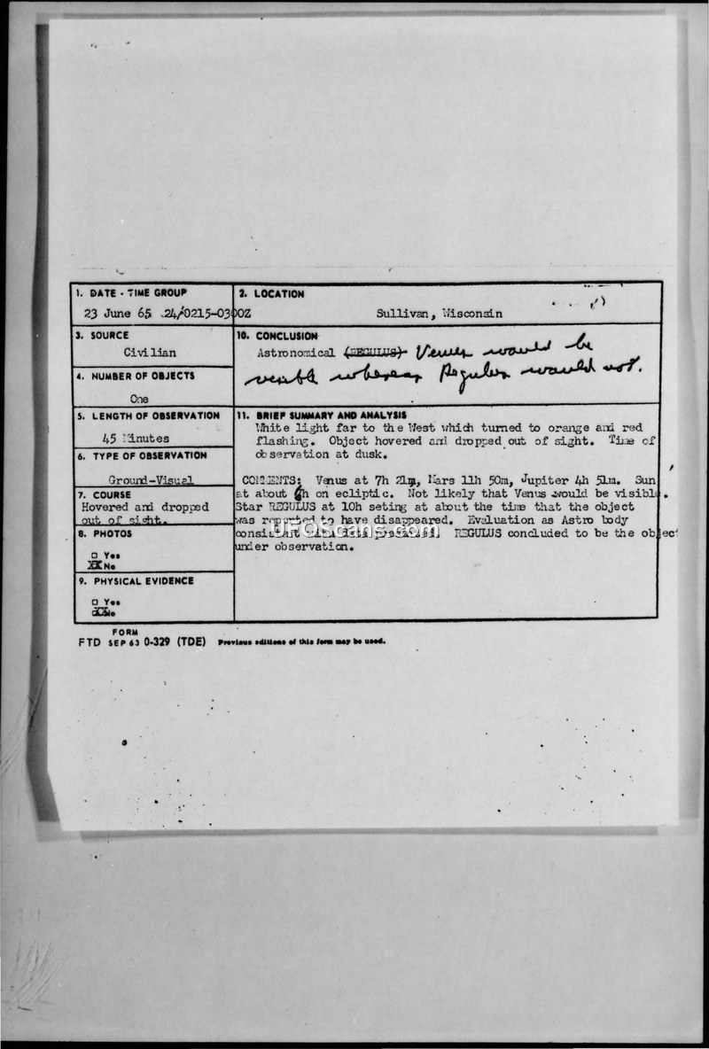A 1965 UFO sighting report from Sullivan, Wisconsin, involving four witnesses who observed a light in the sky. The Air Force investigation concluded the object was the star Regulus.