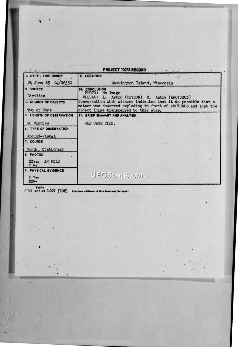 A civilian witness reported a large cylindrical object and smaller craft near Washington Island, Wisconsin, on June 24, 1965. Air Force photo analysis of the submitted slides yielded negative results, and the event was officially attributed to a possible meteor sighting.