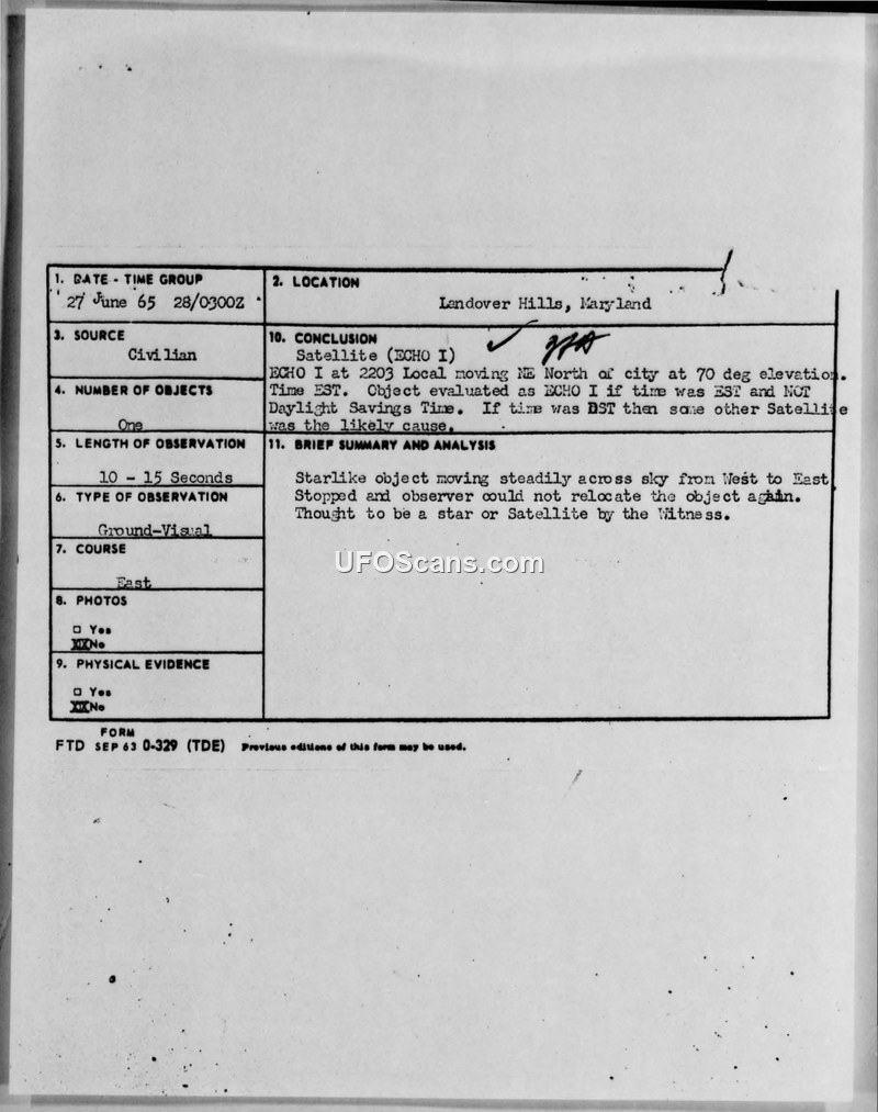 A civilian reported a starlike object in Landover Hills, Maryland, on June 27, 1965. The Air Force identified the object as the Echo I satellite.