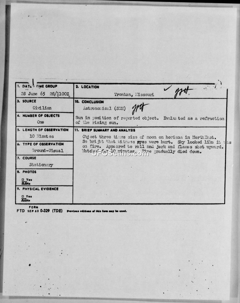 On June 28, 1965, at approximately 5:00 AM, Mrs. H. G. Rains of Trenton, Missouri, observed a bright, fiery, oblong object in the sky from her home. She described the object as being the size of three full moons set side by side, appearing to roll and jerk while emitting flames upward. The object remained stationary for approximately ten minutes before gradually fading away. Mrs. Rains reported that the light was so intense it caused her physical discomfort. She noted that her husband was away at work and her elderly father was the only other person in the house at the time. Following the incident, Mrs. Rains contacted the Air Force's Project Blue Book to report the sighting. The Air Force investigated the claim and concluded that the object was a misidentification of the sunrise. Official correspondence from the Office of Information, signed by Lt. Colonel John P. Spaulding, stated that the sunrise in Trenton on that date occurred at 4:49 AM on a heading of 060 degrees, which aligned with the position of the reported object. The Air Force also referenced an analysis provided by the witness's son, who had suggested the sighting was the sun rising in the northeast, a conclusion the Air Force supported despite the witness's initial disagreement.