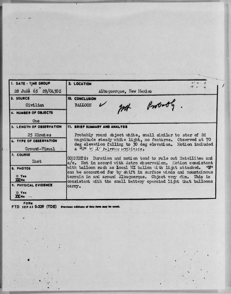 An Air Force report detailing a June 1965 sighting of a light in the sky over Albuquerque by a physicist. The object was officially identified as a weather balloon.