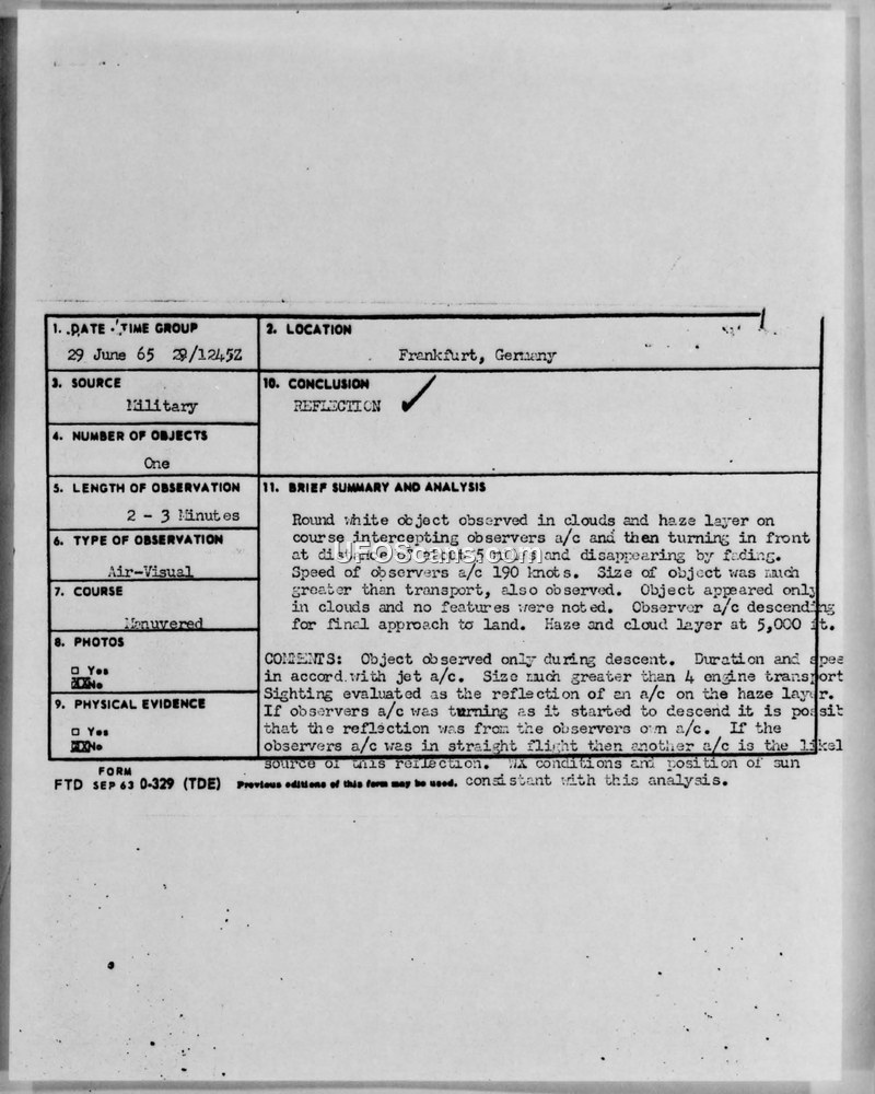 A Federal Aviation Agency pilot reported a round, white object near Frankfurt on 29 June 1965. The Foreign Technology Division concluded the sighting was an aircraft reflection on a haze layer.