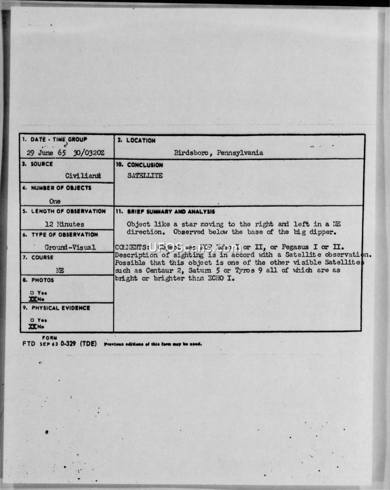 On 29 June 1965, a civilian witness in Birdsboro, Pennsylvania, observed an unidentified aerial phenomenon. The sighting began at 2220 hours and lasted for approximately 12 minutes. The witness described the object as appearing like a star, located below the base of the Big Dipper, moving in a northeast direction. The object was reported to travel slowly, with varying speeds, and moved to the right and left. The witness reported the event to the Olmstead AFB Command Post at 2232 hours. The information was subsequently relayed to the Foreign Technology Division (FTD) Duty Officer, 1/LT Lawrence E. Pence. The official conclusion reached by the Air Force was that the object was a satellite. The report explicitly states that the object was not Echo I, Echo II, Pegasus I, or Pegasus II, but suggested it was likely another visible satellite such as Centaur 2, Saturn 5, or Tyros 9, noting that these objects are as bright or brighter than Echo I.