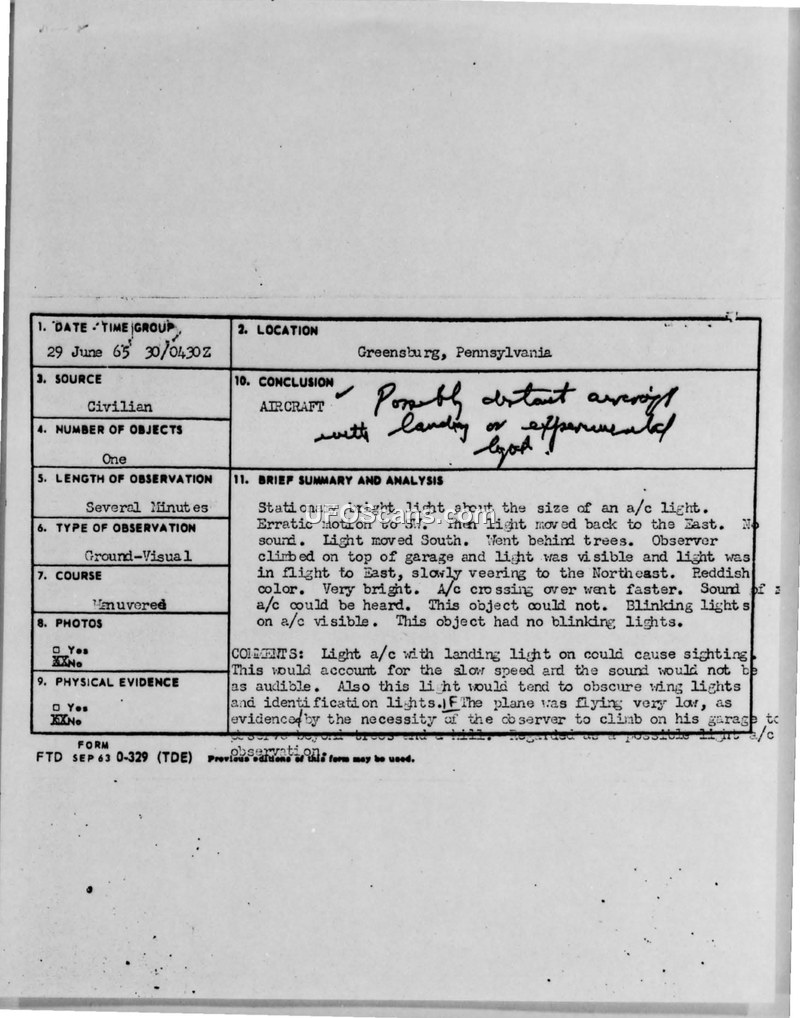 A civilian report of an unidentified light over Greensburg, PA, on June 29, 1965. The Air Force concluded the object was likely a low-flying aircraft with landing lights.