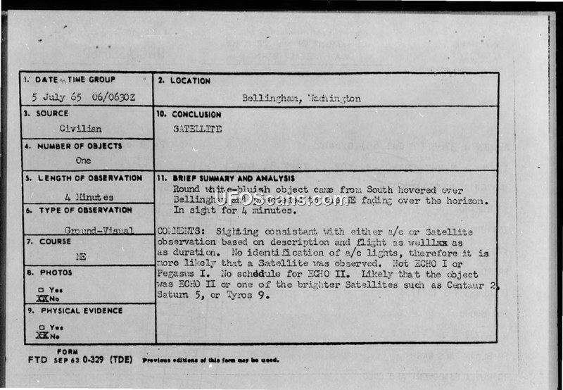 Military reports from July 1965 document two UFO sightings in Bellingham, Washington. Both incidents were officially concluded to be satellite observations by the Foreign Technology Division.