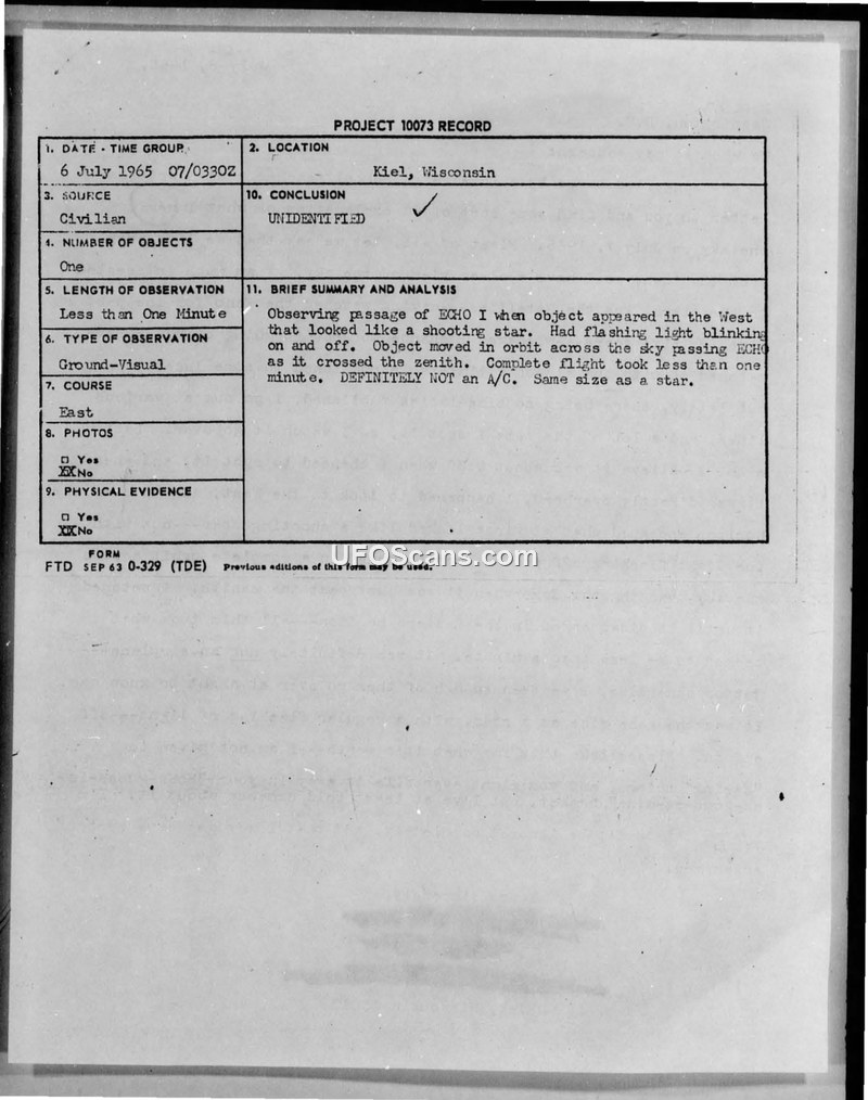 Project 10073 Record — Kiel, Wisconsin, 6 July 1965