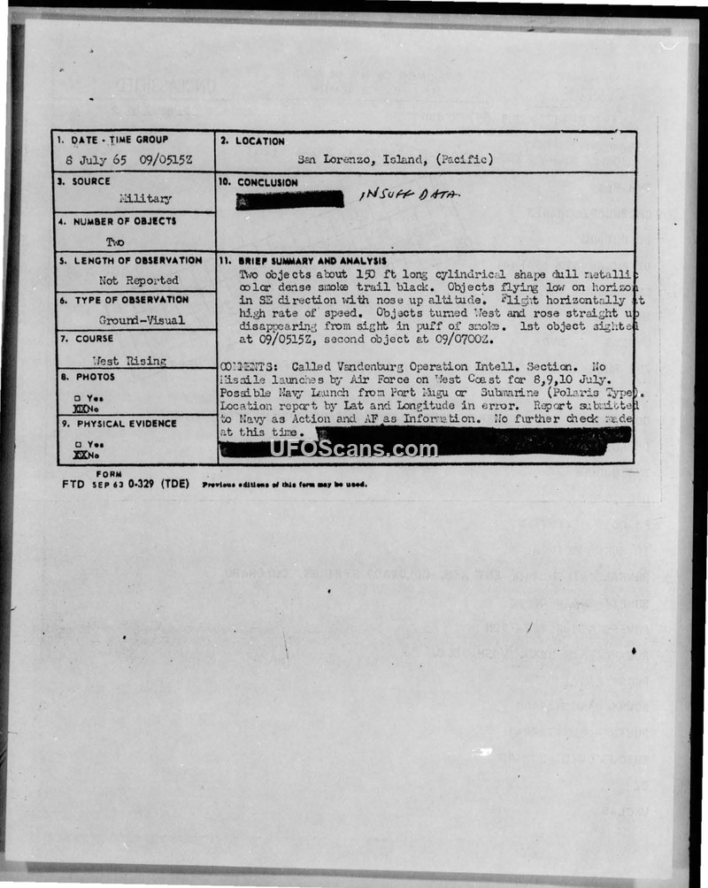 Sighting Report: Unidentified Flying Objects near San Lorenzo Island, 8 July 1965