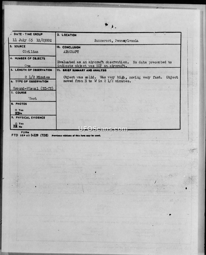 A 1965 sighting report from Summerset, Pennsylvania, where a witness observed a high-altitude object moving East to West. The Air Force concluded the object was an aircraft.