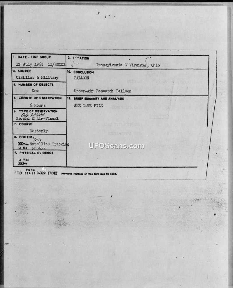UFO Sighting Reports and Investigation — Ohio, Pennsylvania, West Virginia, July 1965