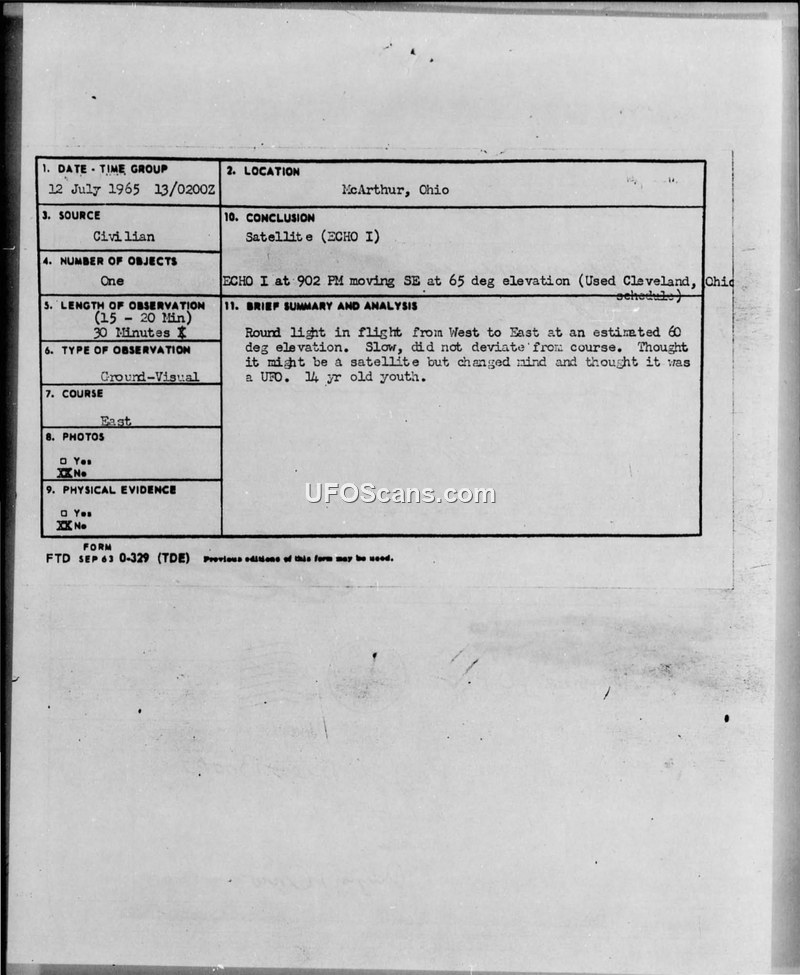 A 14-year-old in McArthur, Ohio, reported a UFO sighting on 12 July 1965. The Air Force investigated the report and concluded the object was the ECHO I satellite.