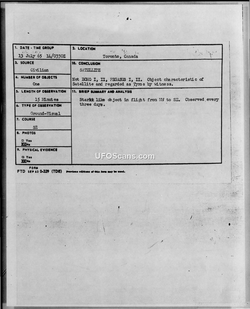 A civilian in Toronto reported a star-like object in July 1965. The Air Force investigated and concluded the object was a satellite, likely a Tyros satellite, noting that atmospheric conditions caused the perceived flight inconsistencies.