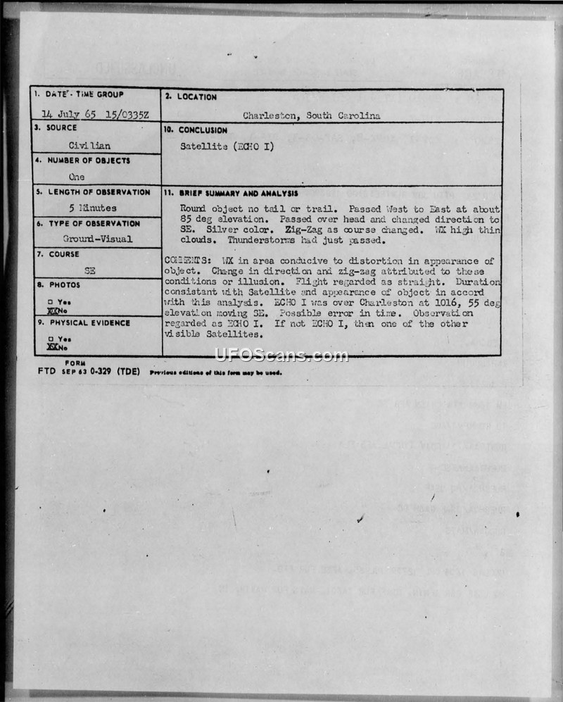 A UFO sighting report from two students in Charleston, SC, on 15 July 1965, was officially attributed to the ECHO I satellite by the Air Force.