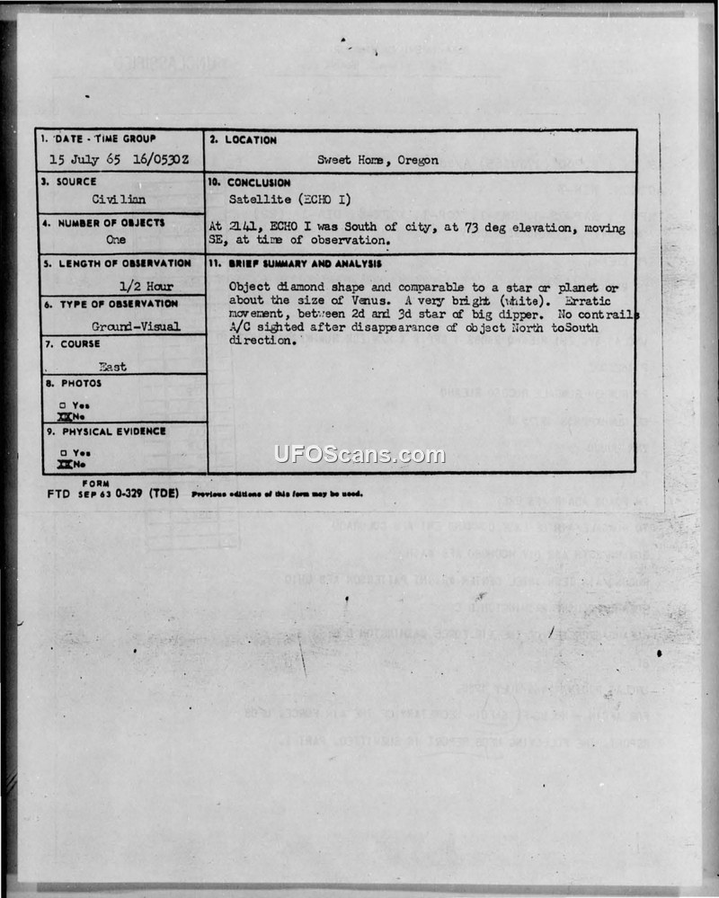 This document is a compilation of reports and correspondence regarding Unidentified Aerial Phenomena (UAP) sightings occurring in July 1965. The primary report details a sighting on July 15, 1965, in Sweet Home, Oregon, where a civilian observer reported a single, diamond-shaped, white, self-luminous object. The object was described as having erratic movement near the Big Dipper and was visible for approximately 30 minutes. The official Air Force conclusion for this specific incident was that the object was the ECHO I satellite. The document also includes a series of other reports from around the globe, including sightings in Canberra, Australia; Warminster, England; Valensole, France; Antarctica; the Azores; and Weymouth, Massachusetts. These reports describe various phenomena, including glowing objects, objects with metal legs, and pulsating lights. The document highlights the tension between official Air Force explanations—which often attribute sightings to balloons, birds, searchlights, or astronomical phenomena—and the views of organizations like the National Investigations Committee for Aerial Phenomena (NICAP), led by Major Donald E. Keyhoe, who argued that the Air Force maintained a policy of explaining away sightings to avoid public alarm. The compilation includes technical information forms filled out by witnesses, correspondence with Dr. J. Allen Hynek, and internal Air Force message traffic summarizing the reports. The document reflects a period of high public interest in UFOs, with numerous reports being evaluated by Project Blue Book at Wright-Patterson Air Force Base.