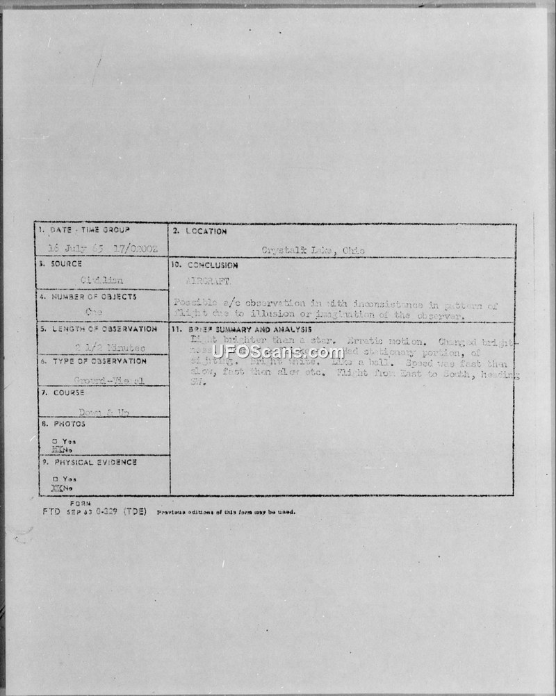 A 14-year-old witness reported a bright, ball-shaped object with erratic movement in Crystal Lake, Ohio, on 16 July 1965. The U.S. Air Force concluded the sighting was likely an aircraft observation misinterpreted by the observer.