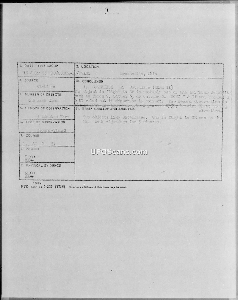 A 1965 UAP sighting report from Greenville, Ohio, involving two light-like objects. The Air Force Foreign Technology Division concluded the objects were satellites.
