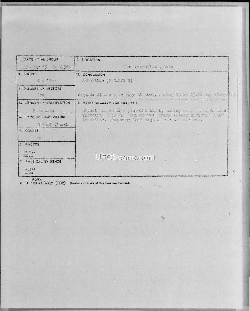 A civilian in West Carrollton, Ohio, reported a white light in the sky on July 19, 1965. The U.S. Air Force Foreign Technology Division concluded the object was the Pegasus II satellite.