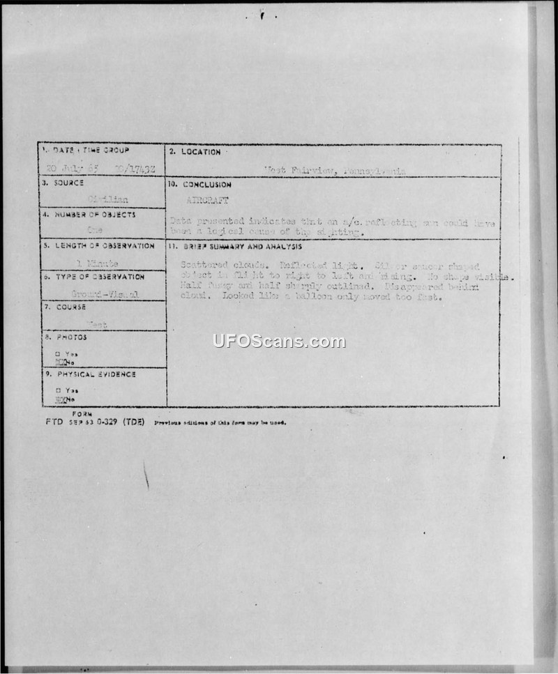 UFO Sighting Report — West Fairview, Pennsylvania, 20 July 1965