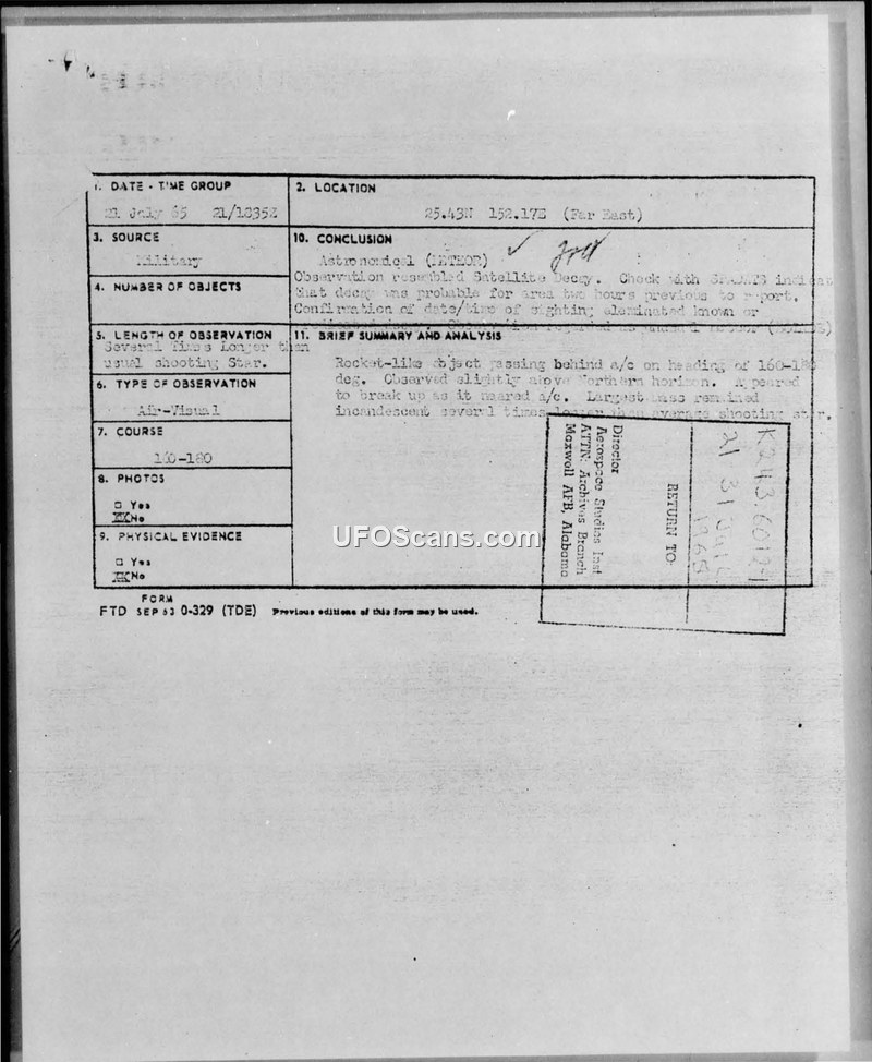UFO Sighting Report — 21 July 1965, Far East