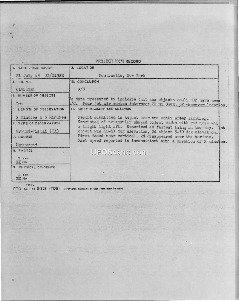 Project 10073 Record: UFO Sighting, Monticello, New York, 22 July 1965