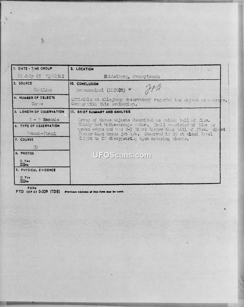A report of three 'molten balls of fire' seen over Heidelberg, PA, on July 22, 1965. The USAF and Allegheny Observatory concluded the objects were meteorites from an expected shower.
