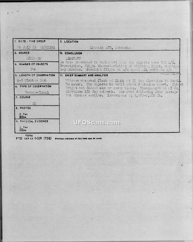 Unidentified Flying Object (UFO) Sighting Report — Lincoln AFB, Nebraska, 25 July 1965