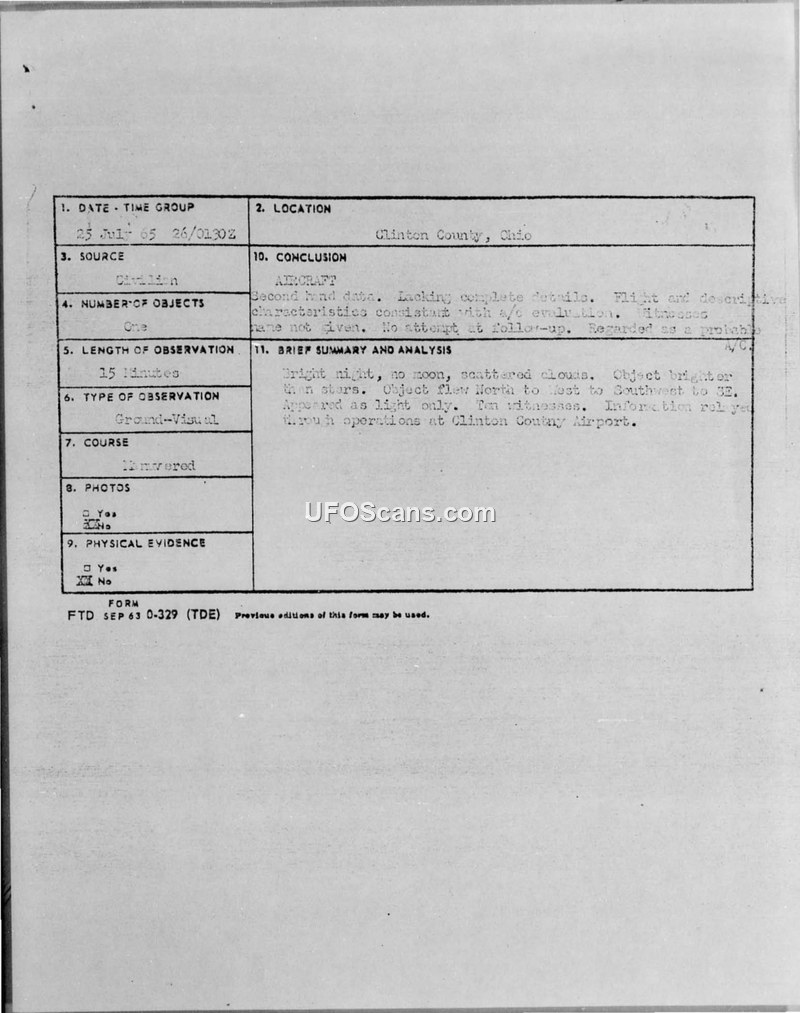 A 1965 U.S. Air Force report regarding a sighting of an unidentified light in Clinton County, Ohio. The incident was officially classified as a probable aircraft due to insufficient data.