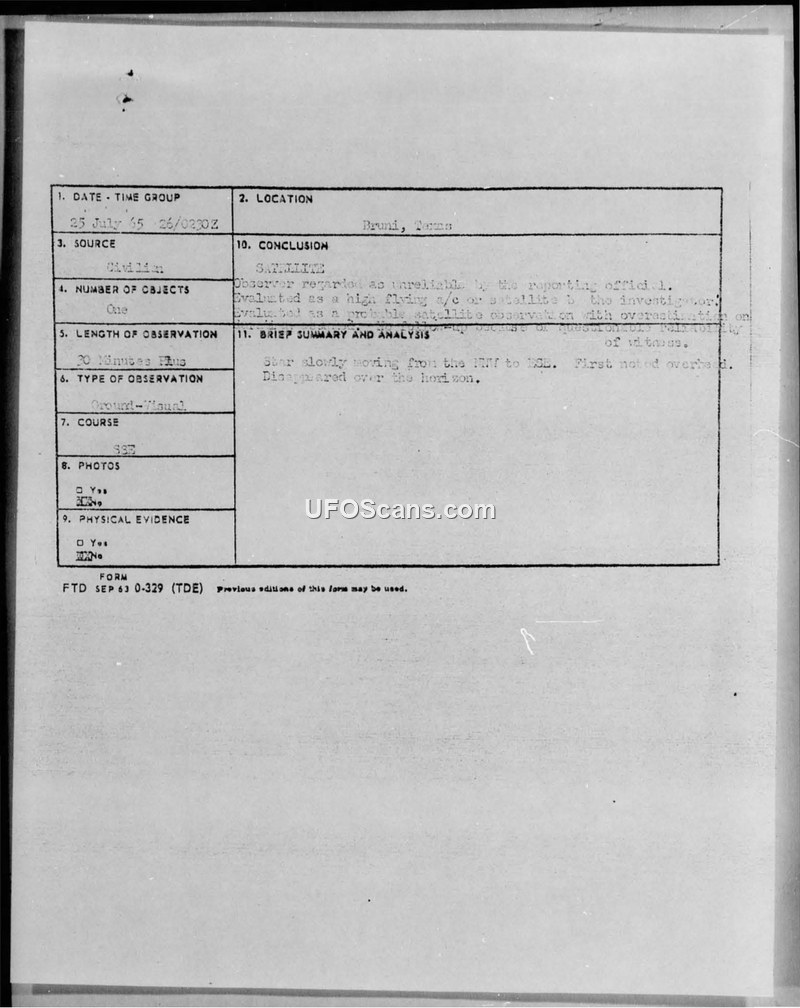 An Air Force report regarding a 1965 sighting in Bruni, Texas, which was dismissed by investigators as an unreliable report of a high-flying aircraft or satellite.