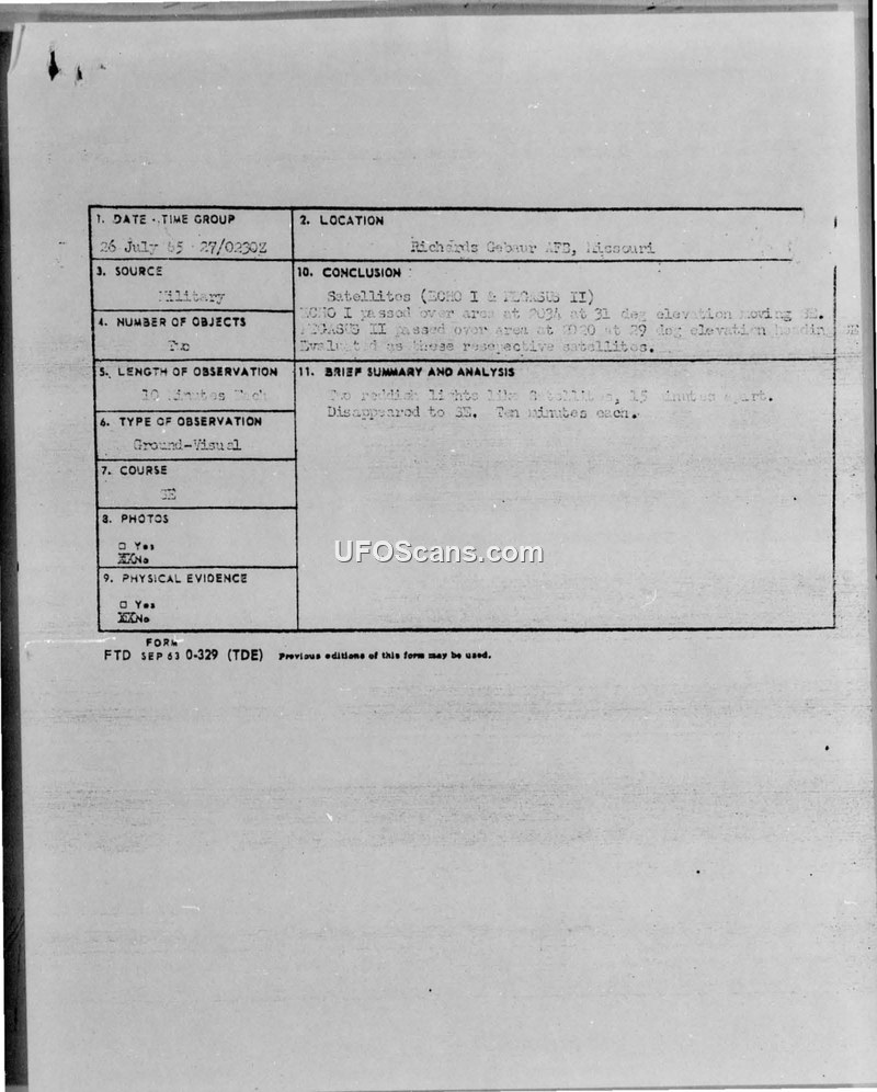 A sighting of two reddish lights near Richards-Gebaur AFB on July 26, 1965, was officially identified by the Foreign Technology Division as the satellites ECHO I and PEGASUS II.
