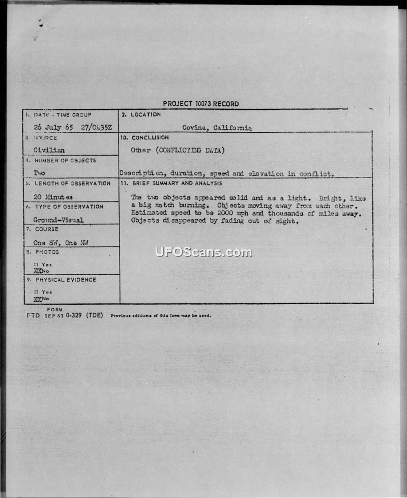 A civilian reported two bright, burning-like objects in the sky over Covina, California, on 26 July 1965. Project Blue Book evaluated the sighting as likely being a jet aircraft with an afterburner, despite conflicting data regarding the duration and speed.