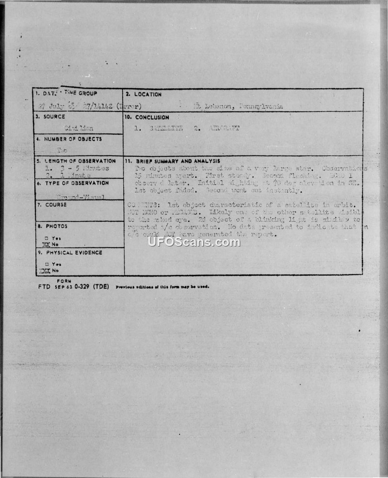 The document contains two separate UFO sighting reports from July 1965, one in Pennsylvania and one in South Carolina. The Air Force concluded one was potentially a meteorite and the other was deemed doubtful.