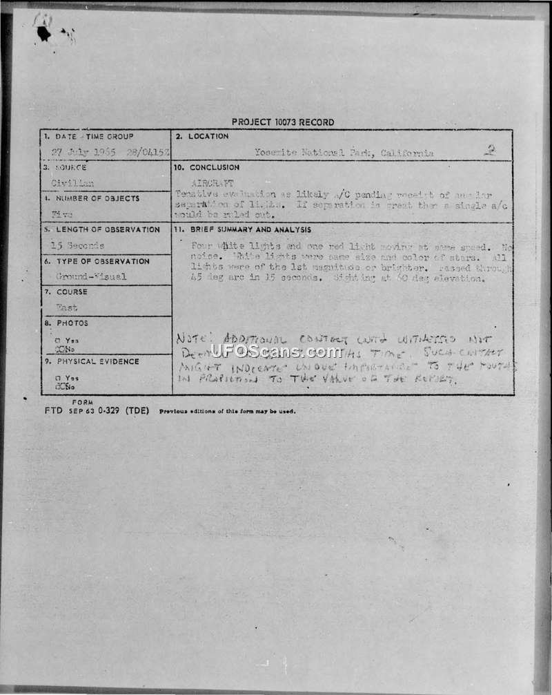A civilian reported five silent, star-like lights moving rapidly over Yosemite National Park on July 27, 1965. Project Blue Book requested further technical data, but internally decided against further contact with the witness to avoid overstating the report's significance.